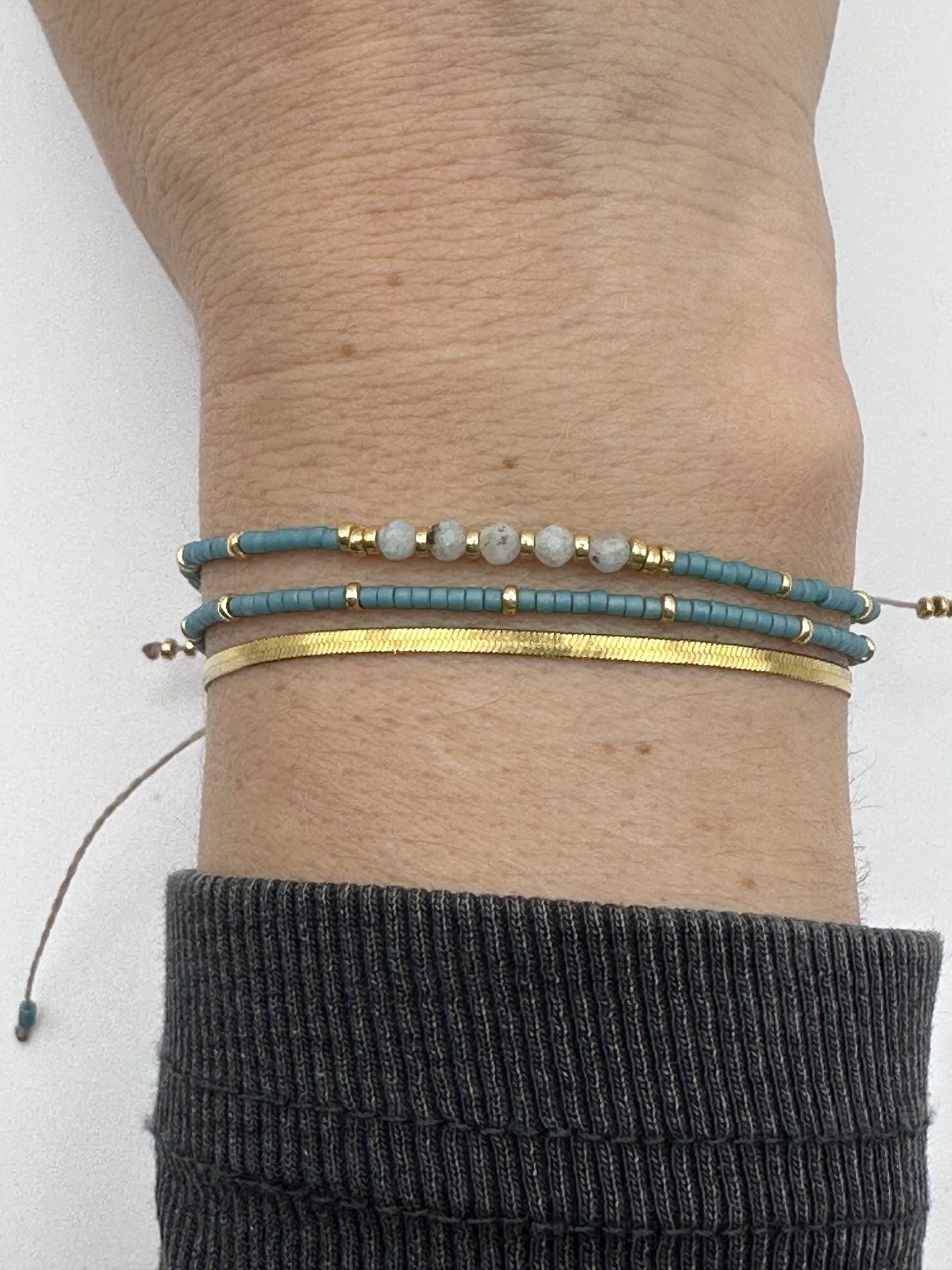 Durch den Makramee Schiebeknoten ist die Größe immer individuell verstellbar und für jeden die perfekte Größe dabei. Da jedes unserer Schmuckstücke handgefertigt ist, können leichte Unregelmäßigkeiten entstehen, welche jedem Stück eine Einzigartigkeit verleihen. Wir haben bei der Herstellung des Armbandes darauf geachtet, dass die Farbe der Edelsteine zur Farbe der Perlen passt.